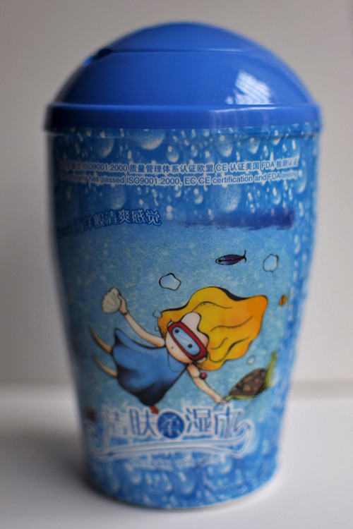 将外包装薄膜撕掉,打开桶盖从柔湿巾卷的内侧抽出一片穿过盖上的